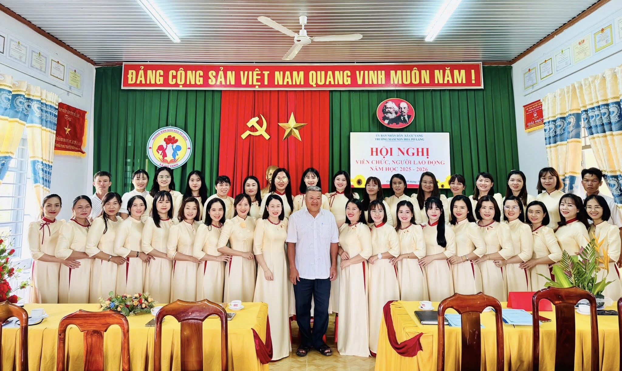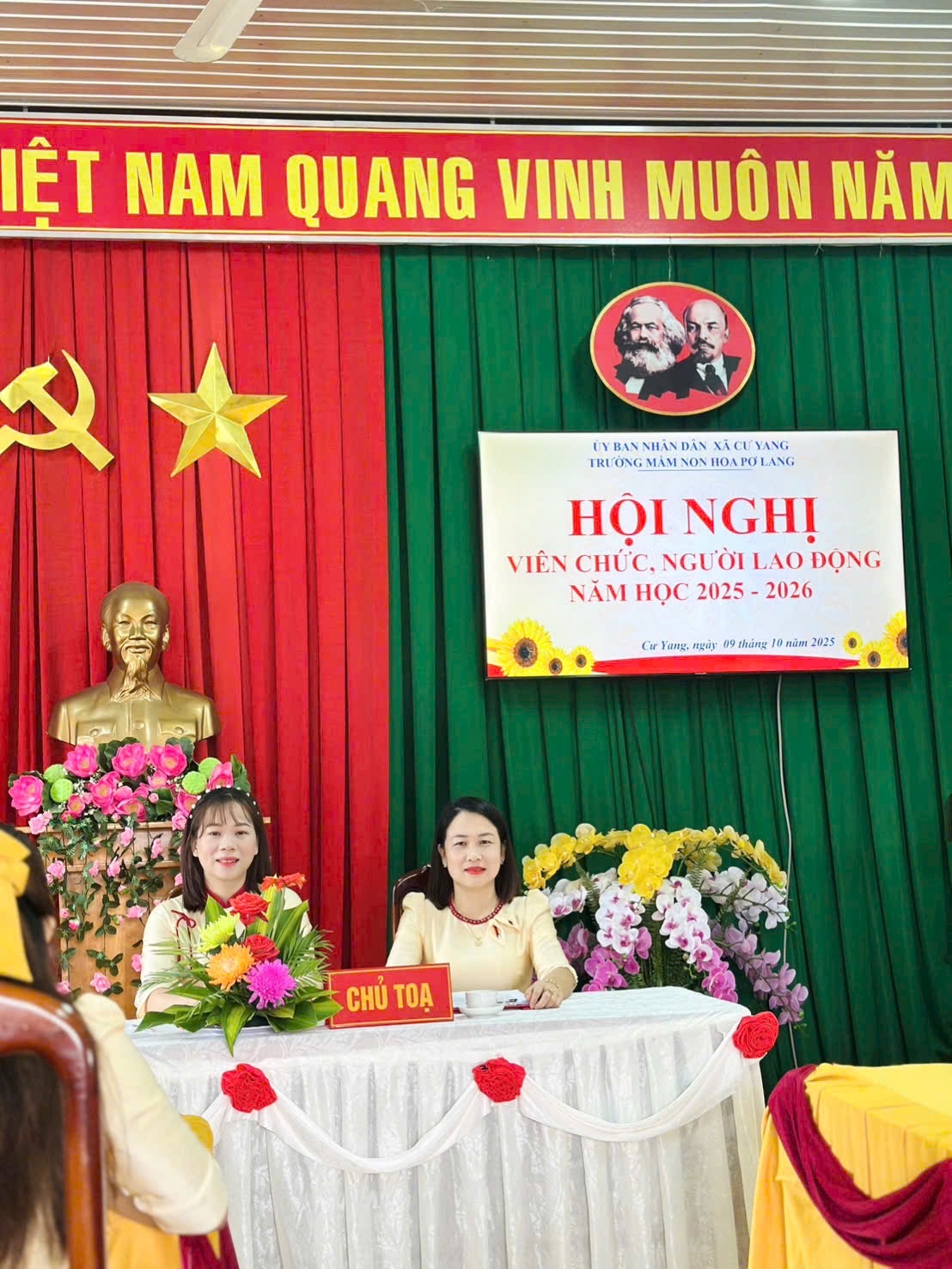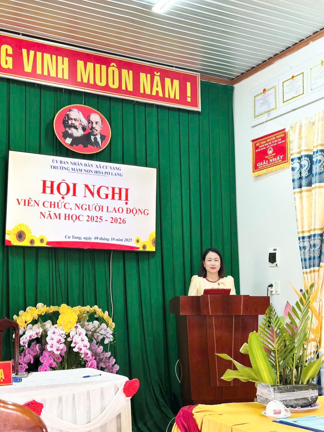 Nhằm tổng kết, đánh giá lại quá trình hoạt động của nhà trường trong năm học vừa qua, đồng thời xác định phương hướng, nhiệm vụ cho năm học mới 2025- 2026. Hôm nay, ngày 09/10/2025- Trường Mầm non Hoa Pơ Lang- xã Cư Yang long trọng tổ chức Hội nghị viên chức, người lao động năm học 2025- 2026. Hội nghị này là cơ hội để tập thể CBGVNV chia sẻ, đóng góp sáng kiến, cũng như thảo luận các biện pháp nhằm nâng cao chất lượng nuôi dưỡng, chăm sóc, giáo dục trẻ và xây dựng môi trường làm việc thân thiện, an toàn, hiệu quả. Đây cũng là dịp để nhà trường lắng nghe nguyện vọng, đề xuất của đội ngũ nhà giáo, người lao động, từ đó xây dựng một tập thể đoàn kết, cùng phấn đấu vì mục tiêu chung là sự phát triển toàn diện của trẻ và sự thành công của nhà trường. Về dự với Hội nghị có sự hiện diện của: